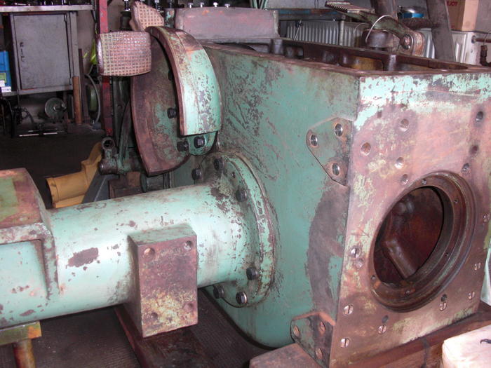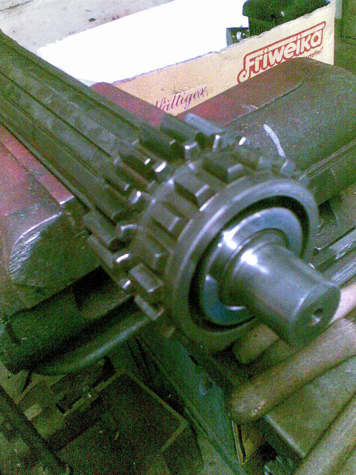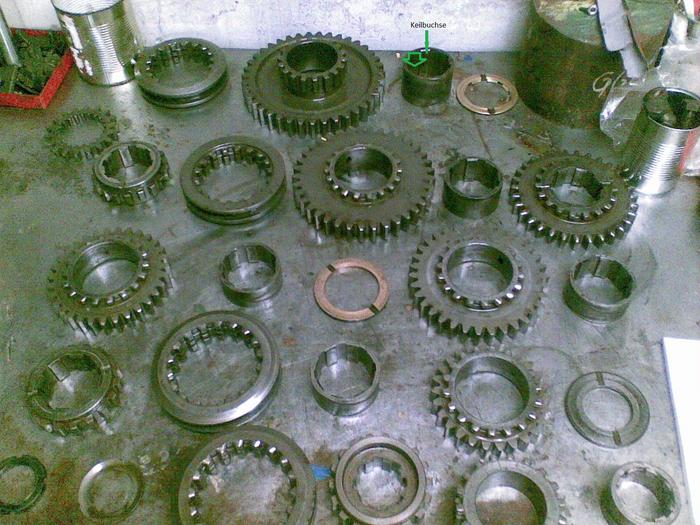 Beim Tellerrad gab es nichts zu meckern es wurde mit neuen Lagern in das Hinterachsgehäuse verbaut.Jetzt konnten wir das Getriebegehäuse wieder an das Hinterachsgehäuse anschrauben und uns den Getriebe widmen.Wir merkten ja schon bei Fahrten das es mächtig gerummpelt hat.Natürlich waren auch hier sämtliche Lager und Buchsen Verschlissen.Nach vermessen stellten wir fest das die Keilbuchsen (Sind auf den Foto unten erkentlich gemacht) 0,8mm spiel zu den Zahnrädern hatten wodurch die Zahnräder regelrecht wackelten.Auch diese Keilbuchsen wurden erneuert und die Zahnräder auf der innenrundschleifmaschine ausgeschliffen weil die Oberfläche stark gelitten hatte.Die Hauptwelle besitzt ein M40x1,5 links Gewinde wo durch eine Nutmutter die Keilbuchsen und Schaltmuffen miteinander verspannt werden,natürlich wie kann es auch anders sein hatte diese Mutter kein Gewinde mehr und wurde durch einen neuangefertigte ersetzt.Das Schulterlager und das Rollenlager welches die Hauptwelle mit Triebling im Gehäuse lagert war auch stark verschlissen,Ersatz war nicht zu bekommen.Beim Rollenlager war glücklicherweiße "nur" der Innenring der auf der Hauptwelle sitzt eingelaufen und wurde von uns neu angefertigt,gehärtet und anschliessend innen und aussen rund geschliffen.Das Schulterlager ersetzten wir duch ein Kugellager welches die selben Kräfte aufnehmen kann wie das Schulterlager.Als das alles in Ordnung gebracht wurde montierten wir mit neuen Kugellagern die Vorgelegewelle mit "Tannenbaum" und anschliessend die Hauptwelle und fädelten die Schalträder und Muffen auf die Hauptwelle.Die Schaltgabeln waren noch sehr gut aber die Veriegelung war mächtig verbastelt und ausgeschlagen.Also Verriegelungsschieber aufgeschweißt und nachgefräst,genauso wurde es mit der Schaltkullise gemacht wo der Schieber langläuft.Jetzt schaltet es wieder einwandfrei wie am ersten Tag.Eine mächtige fummelei ist auch das Kupplungsgehäuse samt antriebsrädern für die Zapfwelle zu montieren.Wir hatten zwar 4 Hände aber platz dafür gab es nicht,trotzdem gelang es uns nach fluchen und schimpfen alles ordnungsgemäß zu montieren.