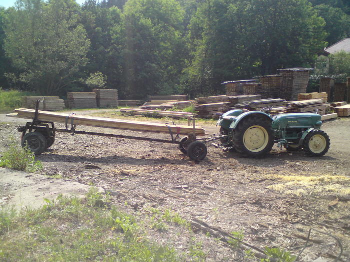 Ist ein Multicar nachläufer,nur der Vorderwagen ist eigenbau.Für den Multicar gab es einen drehkranz der auf die Ladefläche geschraubt wird und dann kam der Nachläufer in die AHK.Das ganze funktioniert ja natürlich nicht bei einen Traktor dafür gibt es einen Vorderwagen.Den Originalen Multicar Vorderwagen müssen wir noch in Schuß bringen da ist einiges Defekt,aber dann ist das Gespann fertig.Lässt sich auch sehr gut fahren das Ganze und folgt auch in der Kurve spurtreu den Schlepper.Nutzlast beträgt 1800 Kg.Die länge ist Variabel und kann so auf das Ladegut angepasst werden bzw.wird bei Leerfahrt "Zusammengefahren".Dabei kann die Rote Fahne am ende nicht Groß genug sein weil es einige Deppen gibt die das Rohr Übersehen.