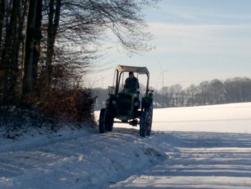 Um an einen Teil meines diesjährigen Brennholzes zu gelangen, muss ich einen Privatweg befahren. Mit dem Besitzer wurde abgemacht, das Brennholz nur bei Frost abzufahren, um den Weg zu schonen. Die letzten beiden Wochenenden waren dazu optimal, Frost bis minus 10 Grad und Schnee.